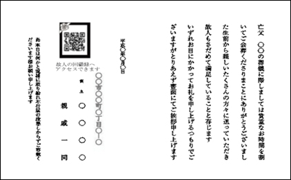 | 通夜、告別式で頂いた会葬礼状に印刷してある「遺影QRコード」をスマートフォン等で読み取ると、故人様の回顧録を見ることが出来ます。 受付が終わって、開式迄の時間に故人を偲んで頂けます。また、会葬礼状を持ち帰れば、参列されなかった人でも、回顧録を見ながら、故人様を偲んで頂けます。 |