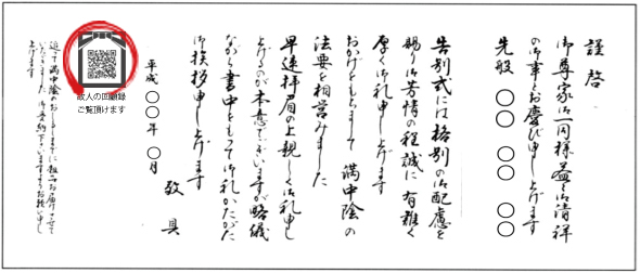 故人の生前に記録が詰まった回顧録を見て頂けるよう、忌明け礼状に遺影QRコードを印刷します。葬儀に参列されなかったご親族様にもご覧いただけます。