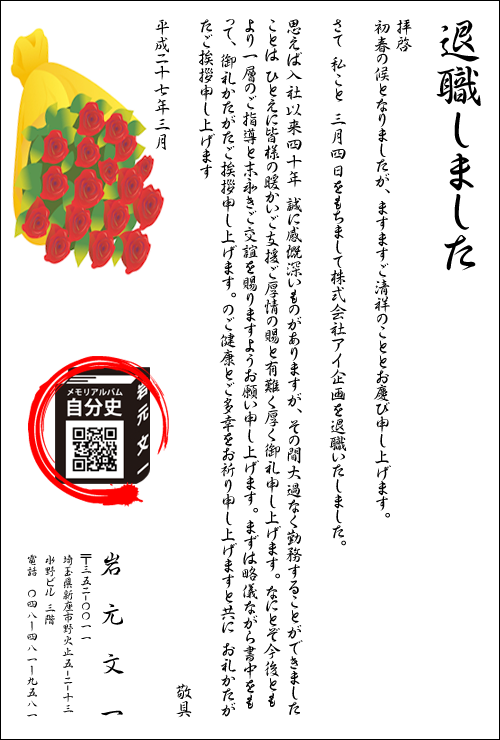 年賀状や季節の挨拶状等、退職の挨拶状に、専用のURLや、専用のイメージQRコードで紹介すれば、近くにいなくても、あなたの自分史を見てもらうことが出来ます。